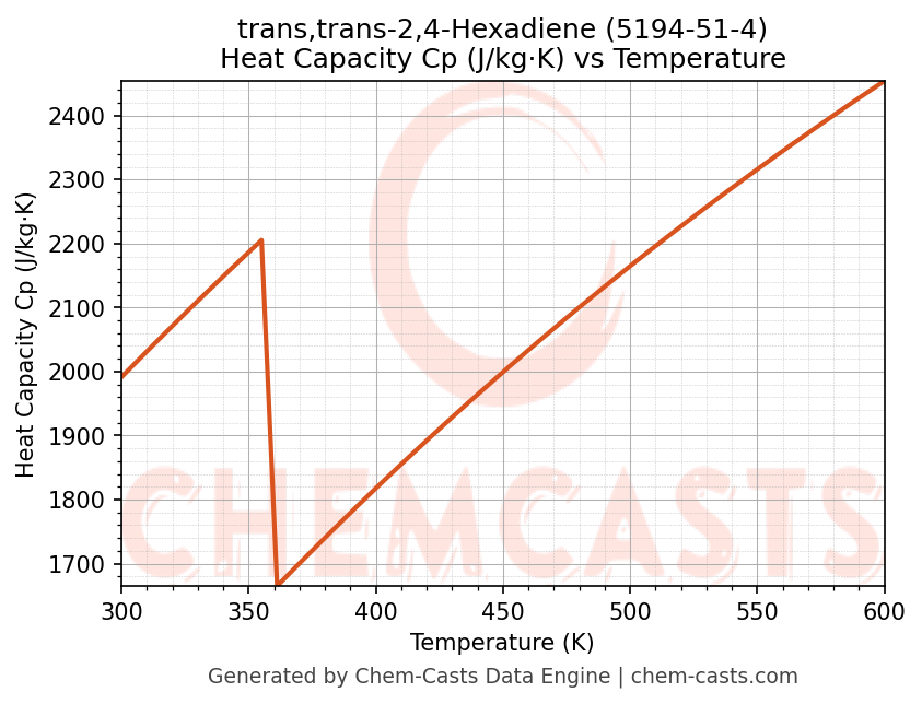 - Specific heat capacity (Cp) indicates the amount of energy required to raise the temperature of trans,trans-2,4-Hexadiene and is critical for energy balance and heat-exchanger design.
