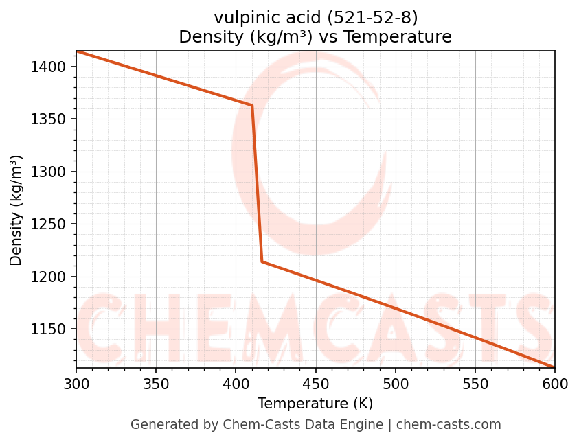 This page presents the temperature-dependent thermodynamic and transport properties of vulpinic acid (CAS 521-52-8) calculated at a constant pressure of 1 atm (101325 Pa) over the temperature range 250-500 K.