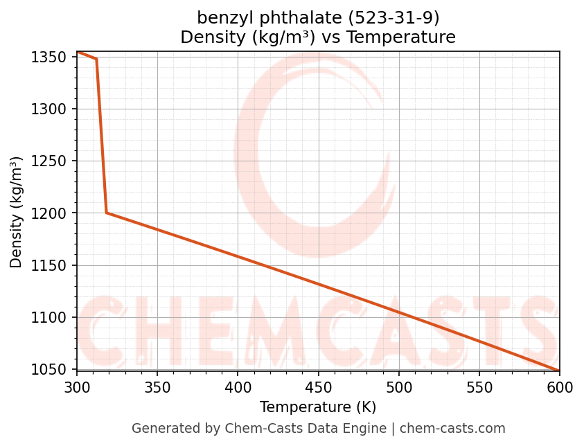 This page presents the temperature-dependent thermodynamic and transport properties of benzyl phthalate (CAS 523-31-9) calculated at a constant pressure of 1 atm (101325 Pa) over the temperature range 250-500 K.