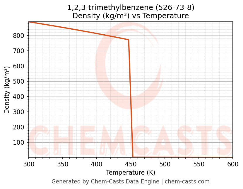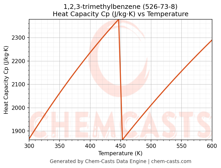 - Specific heat capacity (Cp) indicates the amount of energy required to raise the temperature of 1,2,3-trimethylbenzene and is critical for energy balance and heat-exchanger design.