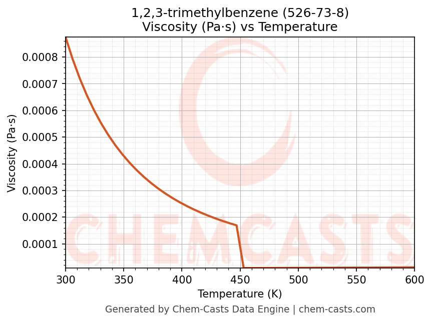This page presents the temperature-dependent thermodynamic and transport properties of 1,2,3-trimethylbenzene (CAS 526-73-8) calculated at a constant pressure of 1 atm (101325 Pa) over the temperature range 250-500 K.