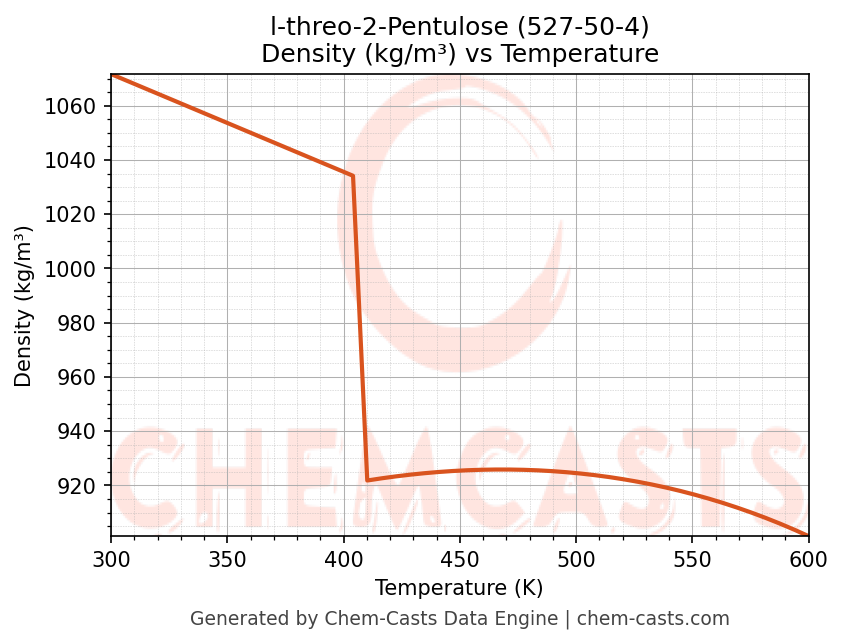 This page presents the temperature-dependent thermodynamic and transport properties of l-threo-2-Pentulose (CAS 527-50-4) calculated at a constant pressure of 1 atm (101325 Pa) over the temperature range 250-500 K.