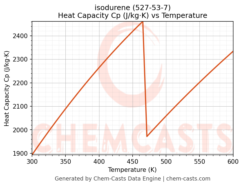 - Specific heat capacity (Cp) indicates the amount of energy required to raise the temperature of isodurene and is critical for energy balance and heat-exchanger design.