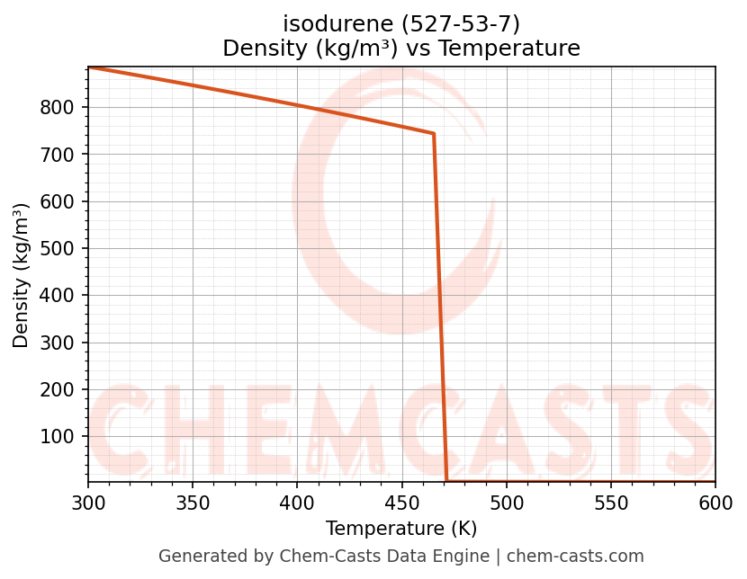 This page presents the temperature-dependent thermodynamic and transport properties of isodurene (CAS 527-53-7) calculated at a constant pressure of 1 atm (101325 Pa) over the temperature range 250-500 K.