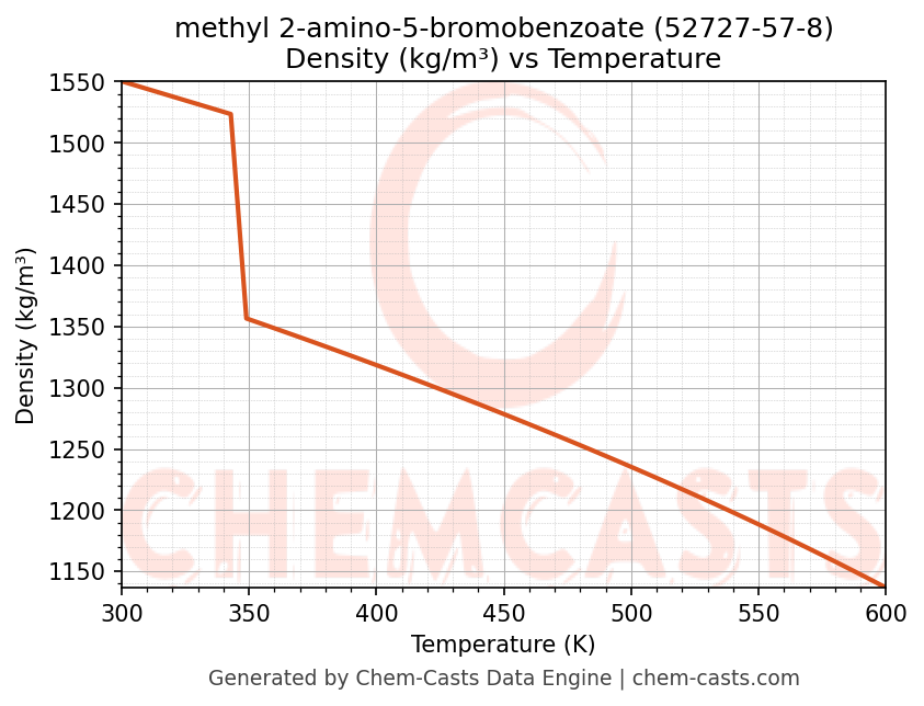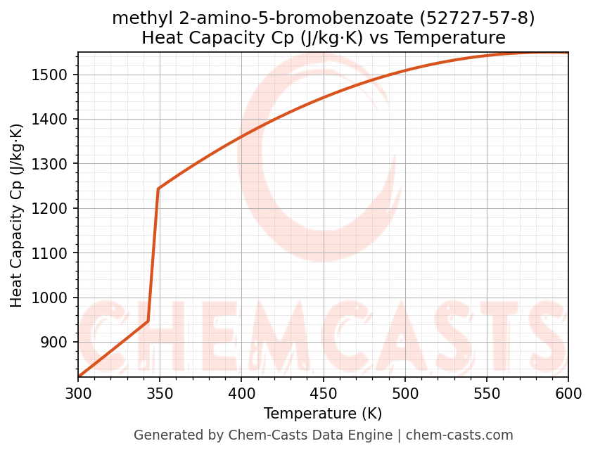 This page presents the temperature-dependent thermodynamic and transport properties of methyl 2-amino-5-bromobenzoate (CAS 52727-57-8) calculated at a constant pressure of 1 atm (101325 Pa) over the temperature range 250-500 K.
