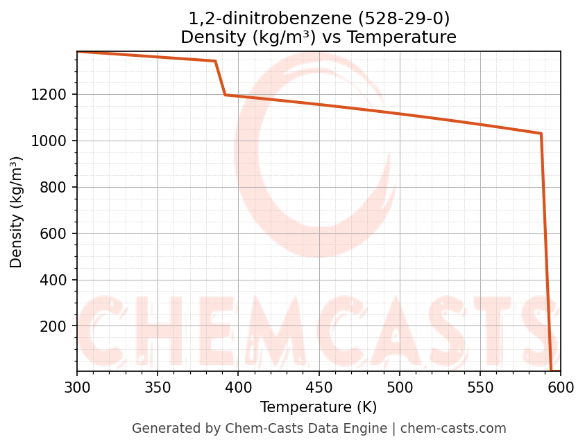 This page presents the temperature-dependent thermodynamic and transport properties of 1,2-dinitrobenzene (CAS 528-29-0) calculated at a constant pressure of 1 atm (101325 Pa) over the temperature range 250-500 K.
