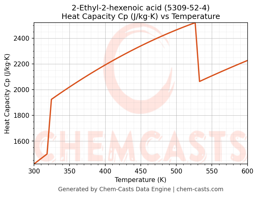 This page presents the temperature-dependent thermodynamic and transport properties of 2-Ethyl-2-hexenoic acid (CAS 5309-52-4) calculated at a constant pressure of 1 atm (101325 Pa) over the temperature range 250-500 K.