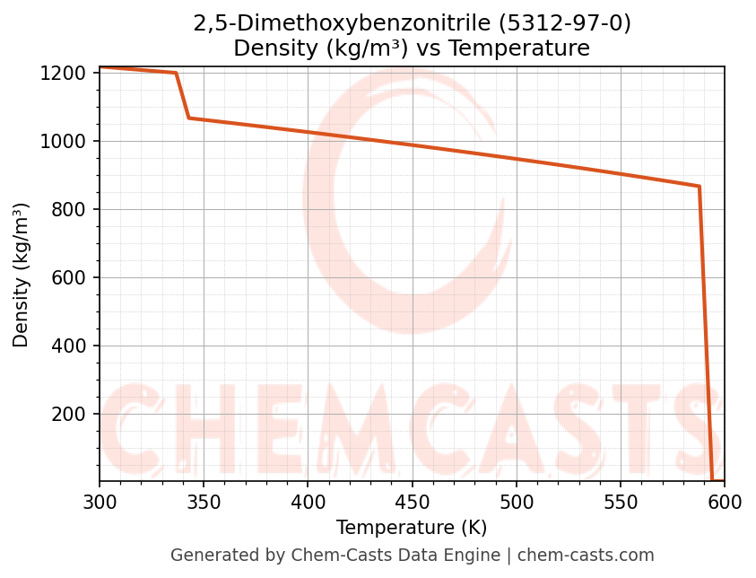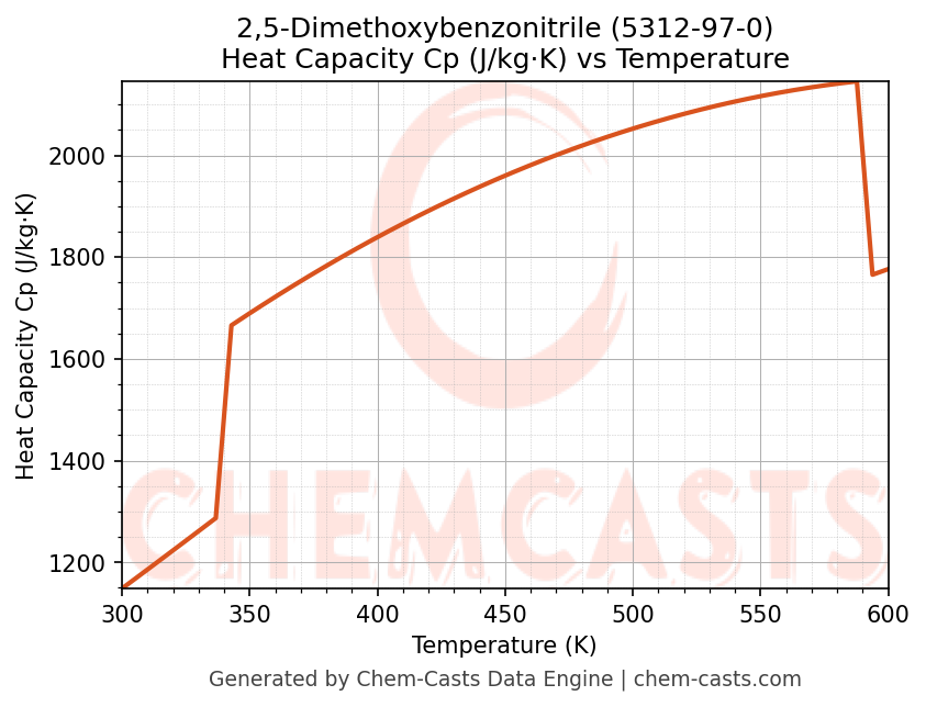 - Specific heat capacity (Cp) indicates the amount of energy required to raise the temperature of 2,5-Dimethoxybenzonitrile and is critical for energy balance and heat-exchanger design.