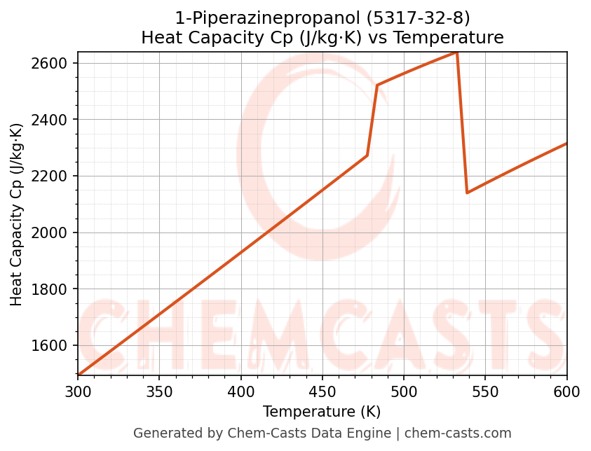 - Specific heat capacity (Cp) indicates the amount of energy required to raise the temperature of 1-Piperazinepropanol and is critical for energy balance and heat-exchanger design.