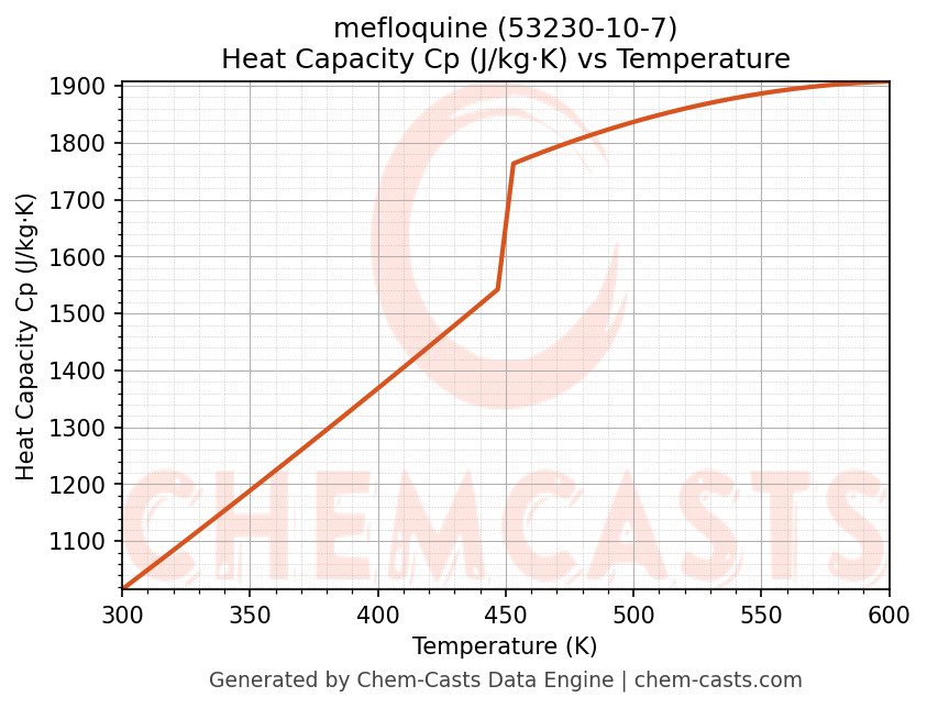 - Specific heat capacity (Cp) indicates the amount of energy required to raise the temperature of mefloquine and is critical for energy balance and heat-exchanger design.
