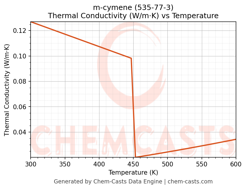 This page presents the temperature-dependent thermodynamic and transport properties of m-cymene (CAS 535-77-3) calculated at a constant pressure of 1 atm (101325 Pa) over the temperature range 250-500 K.