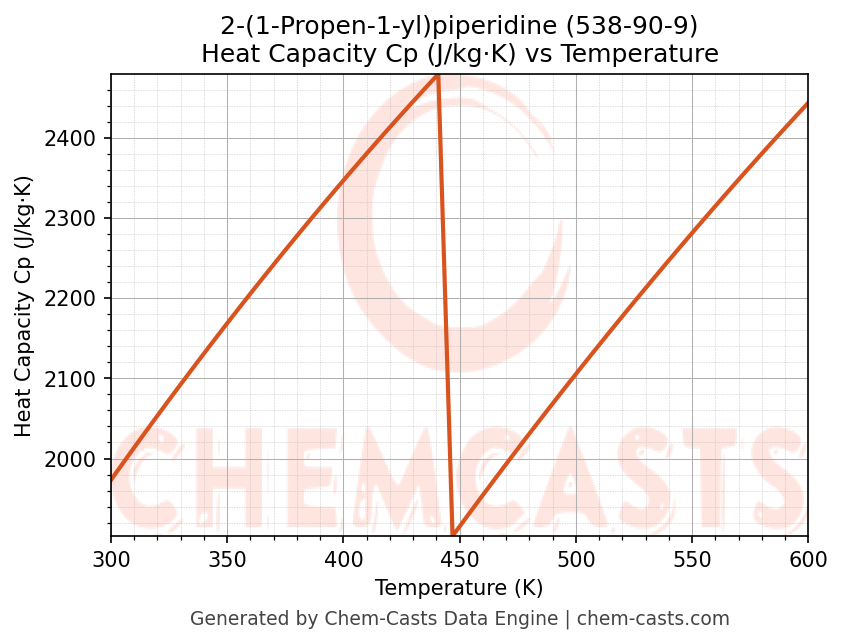 This page presents the temperature-dependent thermodynamic and transport properties of 2-(1-Propen-1-yl)piperidine (CAS 538-90-9) calculated at a constant pressure of 1 atm (101325 Pa) over the temperature range 250-500 K.