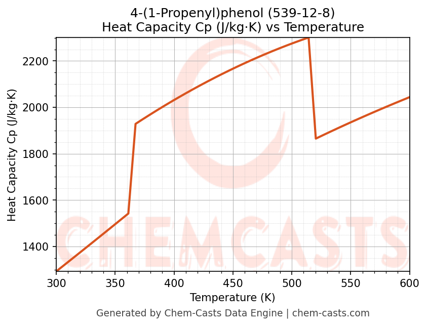 - Specific heat capacity (Cp) indicates the amount of energy required to raise the temperature of 4-(1-Propenyl)phenol and is critical for energy balance and heat-exchanger design.