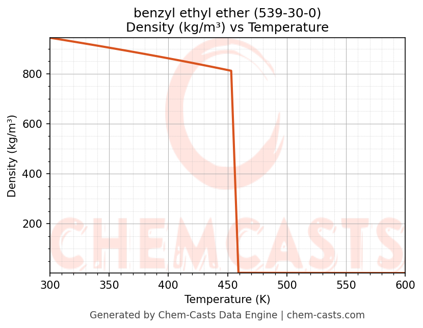 This page presents the temperature-dependent thermodynamic and transport properties of benzyl ethyl ether (CAS 539-30-0) calculated at a constant pressure of 1 atm (101325 Pa) over the temperature range 250-500 K.