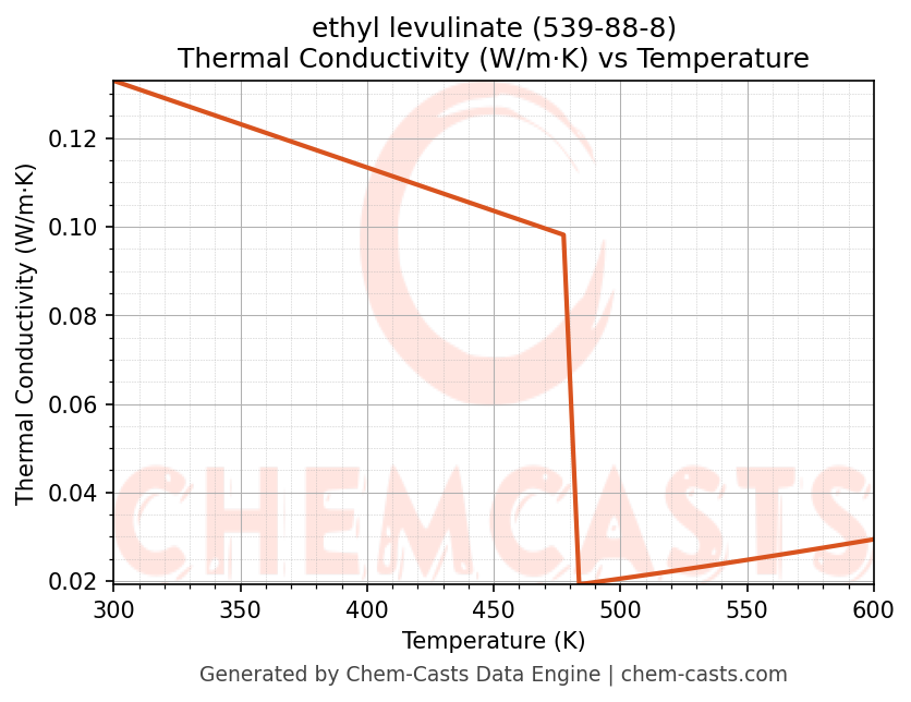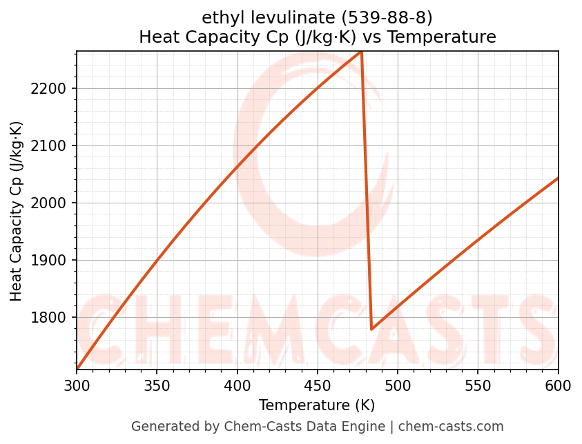 This page presents the temperature-dependent thermodynamic and transport properties of ethyl levulinate (CAS 539-88-8) calculated at a constant pressure of 1 atm (101325 Pa) over the temperature range 250-500 K.