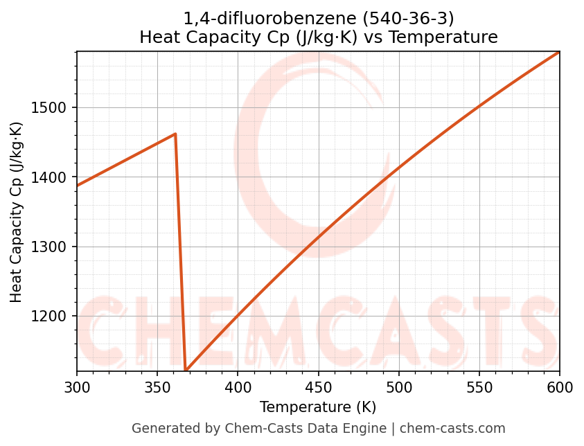- Specific heat capacity (Cp) indicates the amount of energy required to raise the temperature of 1,4-difluorobenzene and is critical for energy balance and heat-exchanger design.