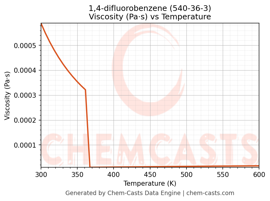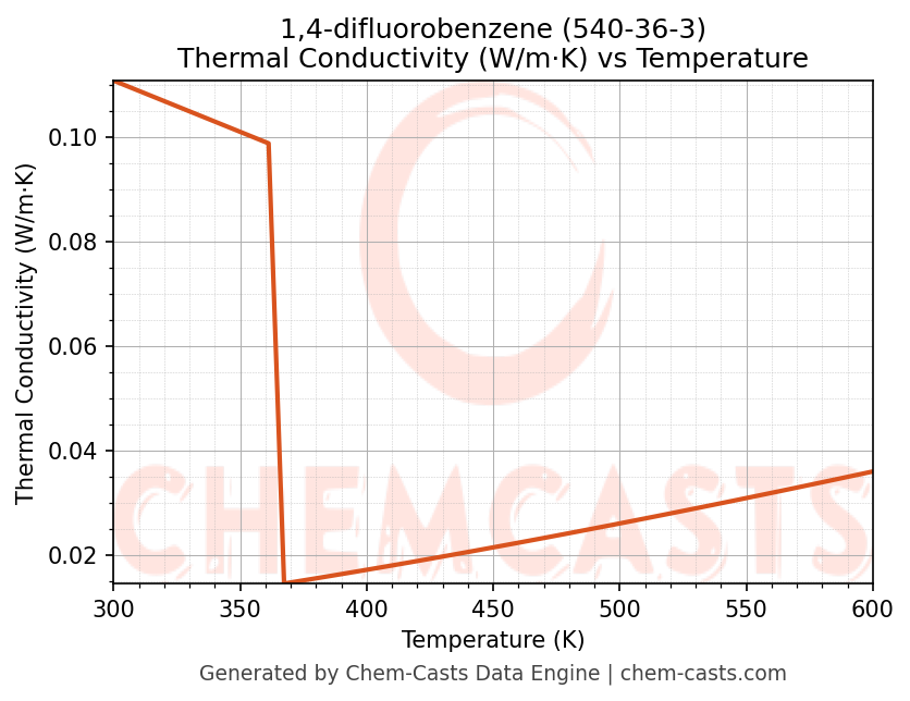 This page presents the temperature-dependent thermodynamic and transport properties of 1,4-difluorobenzene (CAS 540-36-3) calculated at a constant pressure of 1 atm (101325 Pa) over the temperature range 250-500 K.