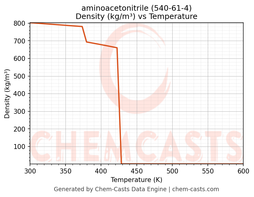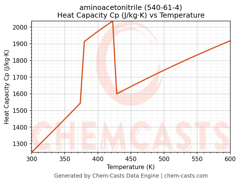 - Specific heat capacity (Cp) indicates the amount of energy required to raise the temperature of aminoacetonitrile and is critical for energy balance and heat-exchanger design.