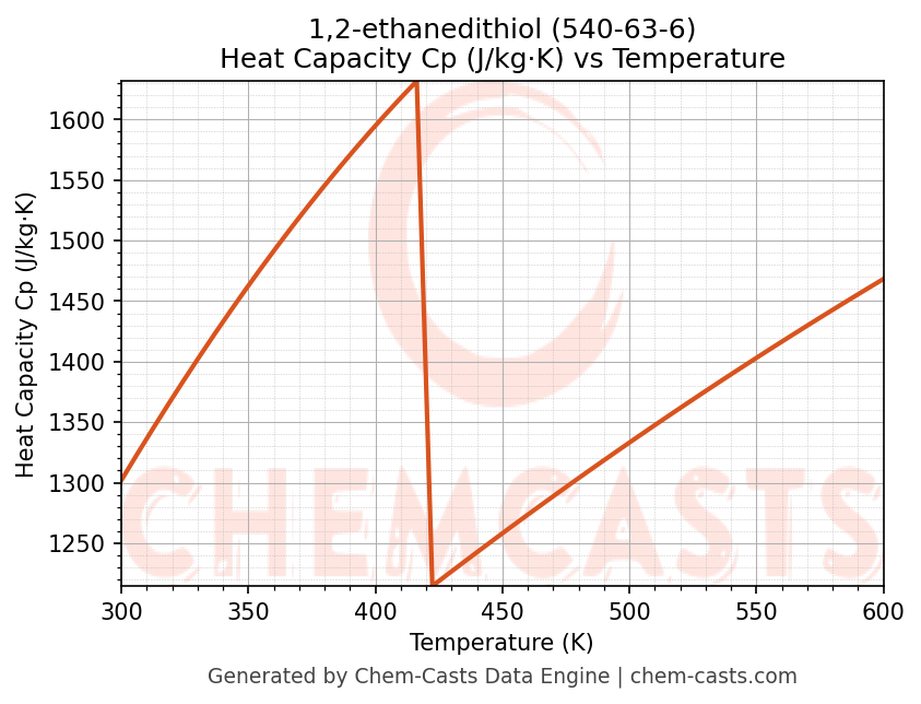 - Specific heat capacity (Cp) indicates the amount of energy required to raise the temperature of 1,2-ethanedithiol and is critical for energy balance and heat-exchanger design.