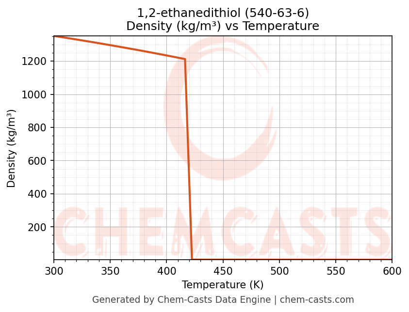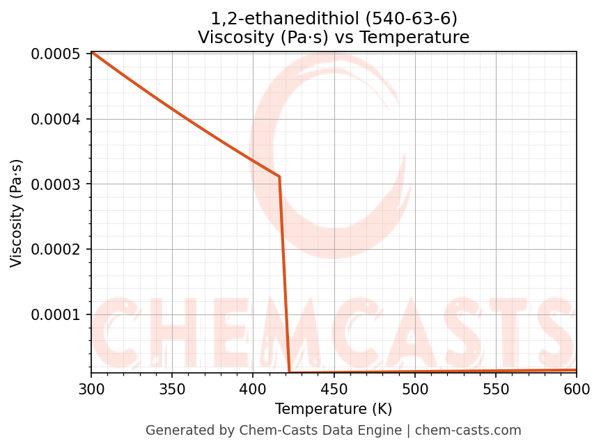 This page presents the temperature-dependent thermodynamic and transport properties of 1,2-ethanedithiol (CAS 540-63-6) calculated at a constant pressure of 1 atm (101325 Pa) over the temperature range 250-500 K.