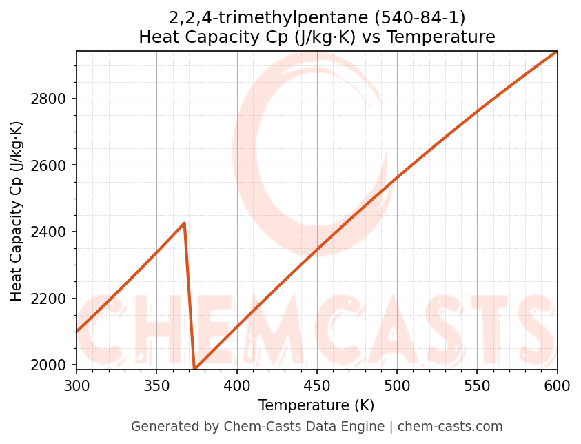 - Specific heat capacity (Cp) indicates the amount of energy required to raise the temperature of 2,2,4-trimethylpentane and is critical for energy balance and heat-exchanger design.