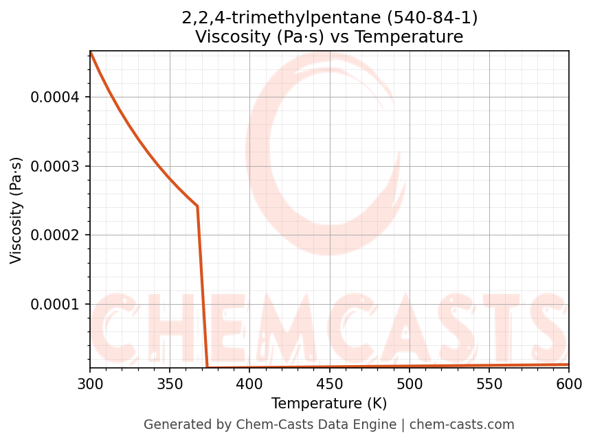 This page presents the temperature-dependent thermodynamic and transport properties of 2,2,4-trimethylpentane (CAS 540-84-1) calculated at a constant pressure of 1 atm (101325 Pa) over the temperature range 250-500 K.