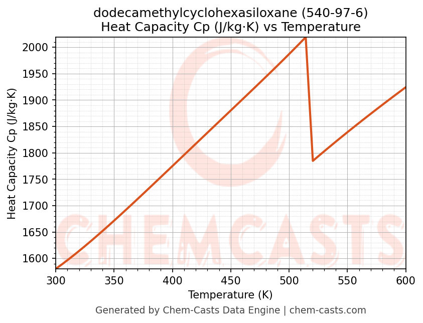 - Specific heat capacity (Cp) indicates the amount of energy required to raise the temperature of dodecamethylcyclohexasiloxane and is critical for energy balance and heat-exchanger design.