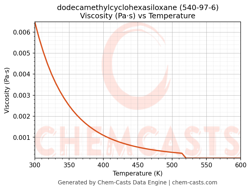 This page presents the temperature-dependent thermodynamic and transport properties of dodecamethylcyclohexasiloxane (CAS 540-97-6) calculated at a constant pressure of 1 atm (101325 Pa) over the temperature range 250-500 K.