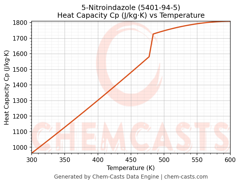 - Specific heat capacity (Cp) indicates the amount of energy required to raise the temperature of 5-Nitroindazole and is critical for energy balance and heat-exchanger design.