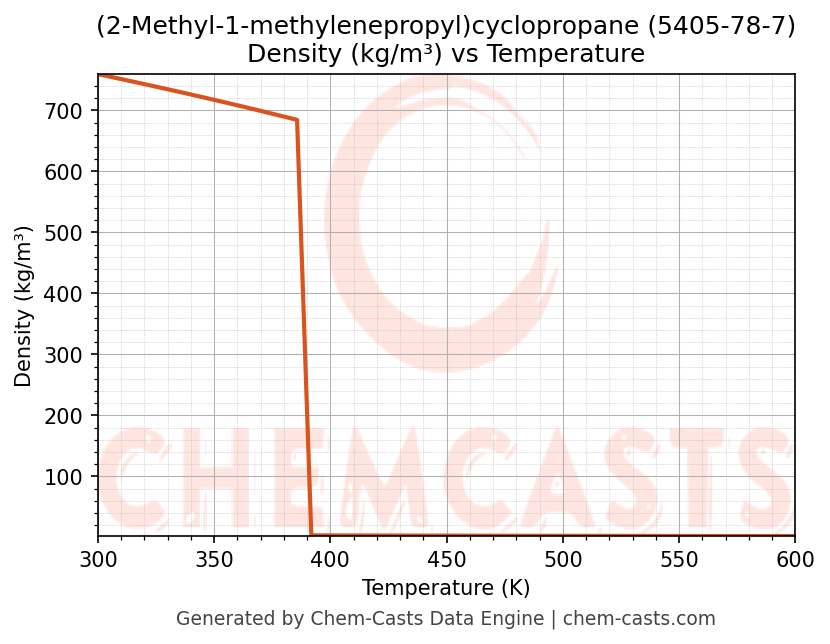 This page presents the temperature-dependent thermodynamic and transport properties of (2-Methyl-1-methylenepropyl)cyclopropane (CAS 5405-78-7) calculated at a constant pressure of 1 atm (101325 Pa) over the temperature range 250-500 K.
