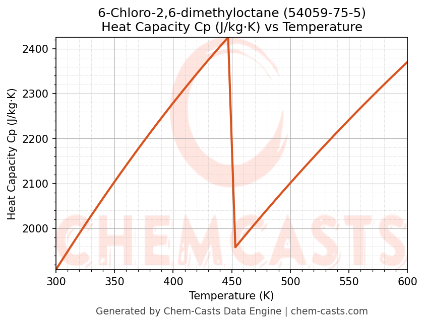 - Specific heat capacity (Cp) indicates the amount of energy required to raise the temperature of 6-Chloro-2,6-dimethyloctane and is critical for energy balance and heat-exchanger design.