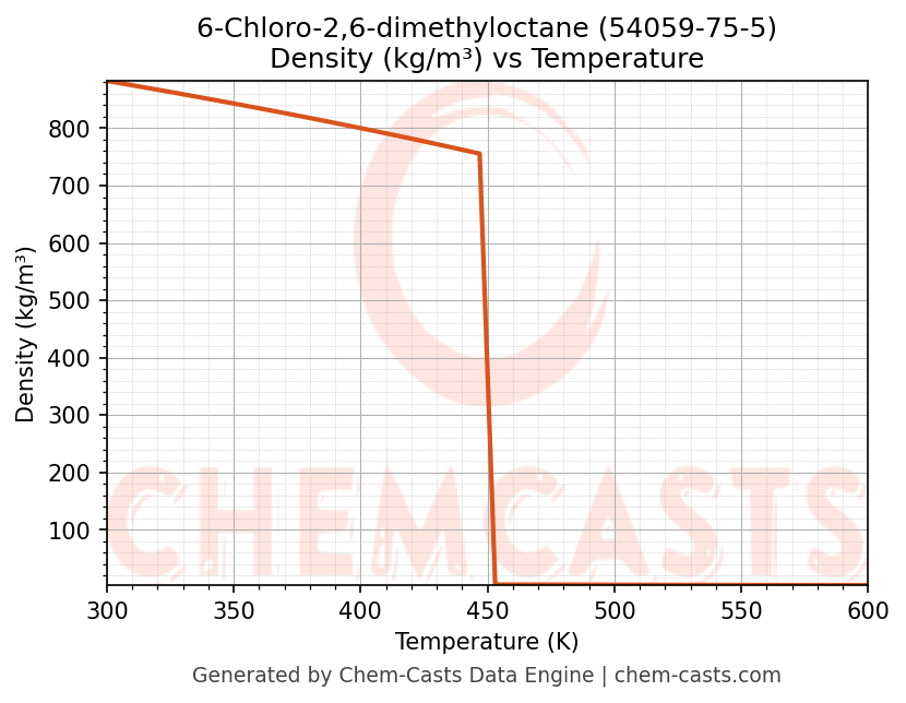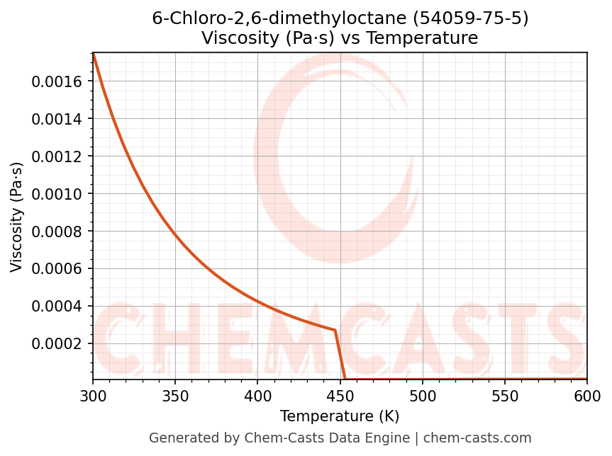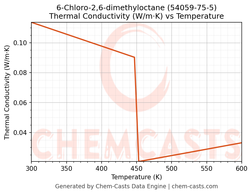 This page presents the temperature-dependent thermodynamic and transport properties of 6-Chloro-2,6-dimethyloctane (CAS 54059-75-5) calculated at a constant pressure of 1 atm (101325 Pa) over the temperature range 250-500 K.