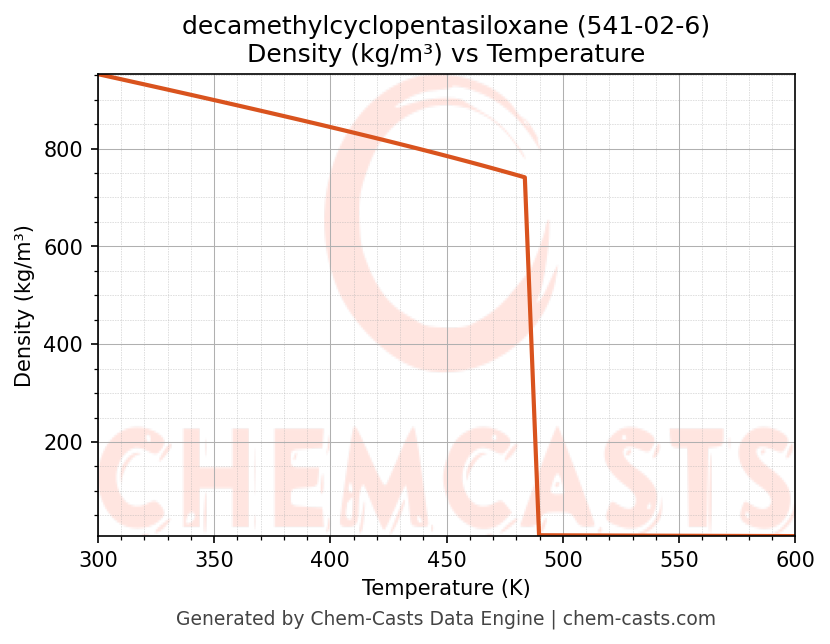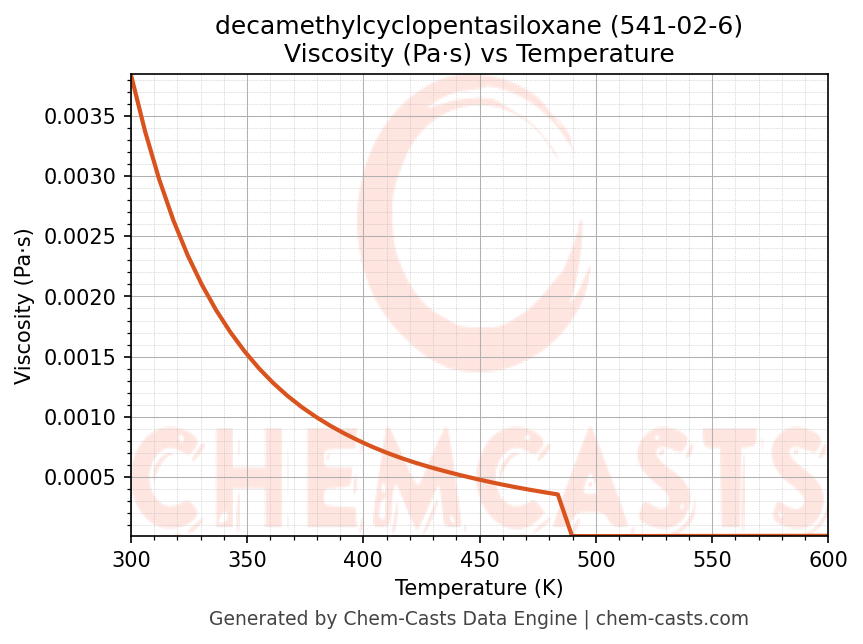 This page presents the temperature-dependent thermodynamic and transport properties of decamethylcyclopentasiloxane (CAS 541-02-6) calculated at a constant pressure of 1 atm (101325 Pa) over the temperature range 250-500 K.