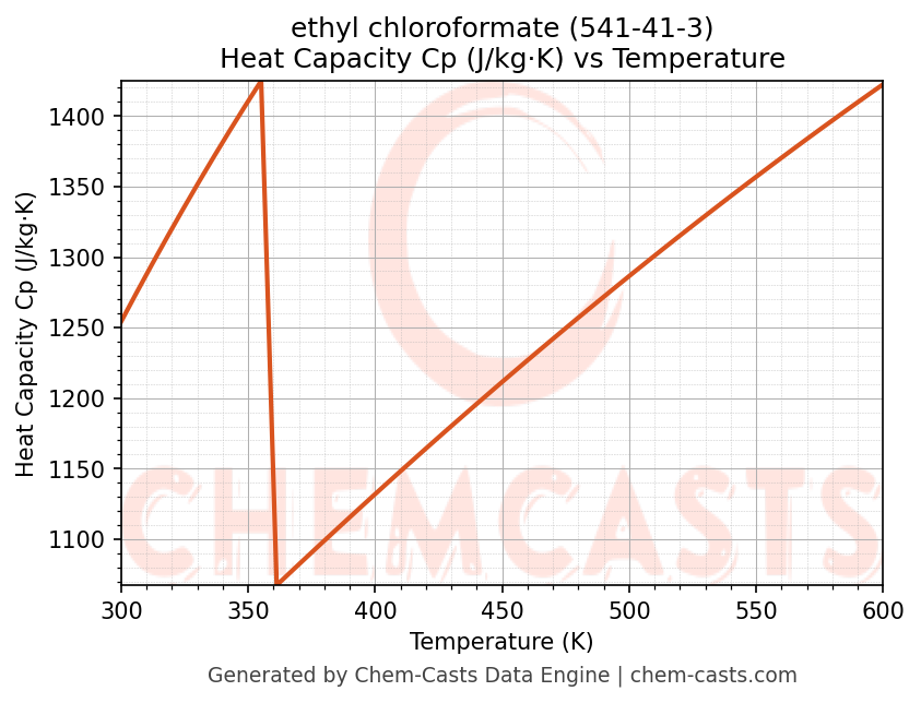 This page presents the temperature-dependent thermodynamic and transport properties of ethyl chloroformate (CAS 541-41-3) calculated at a constant pressure of 1 atm (101325 Pa) over the temperature range 250-500 K.