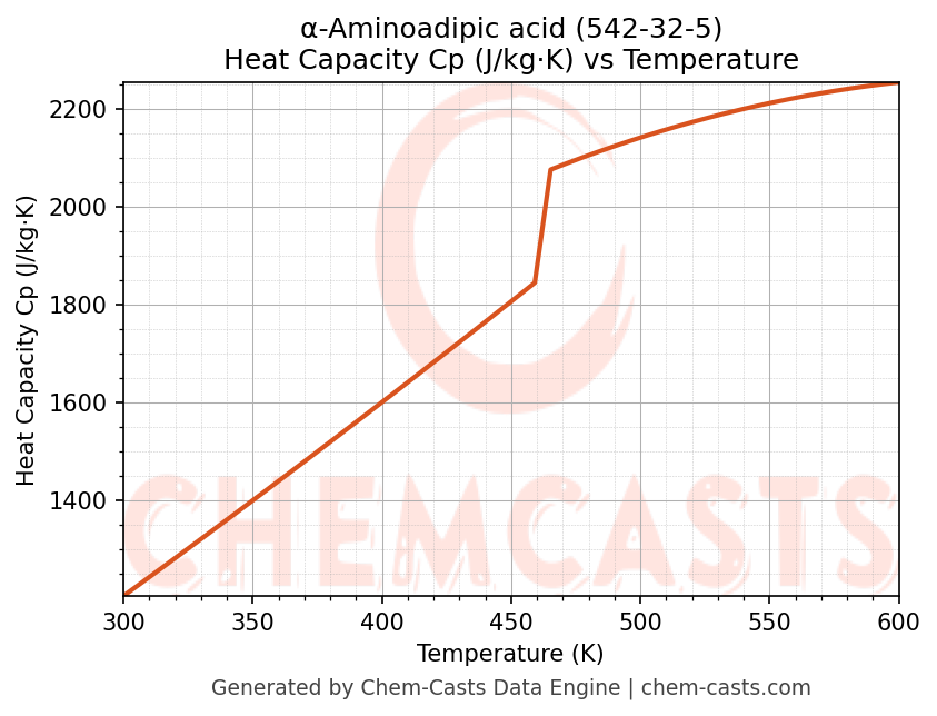 - Specific heat capacity (Cp) indicates the amount of energy required to raise the temperature of α-Aminoadipic acid and is critical for energy balance and heat-exchanger design.