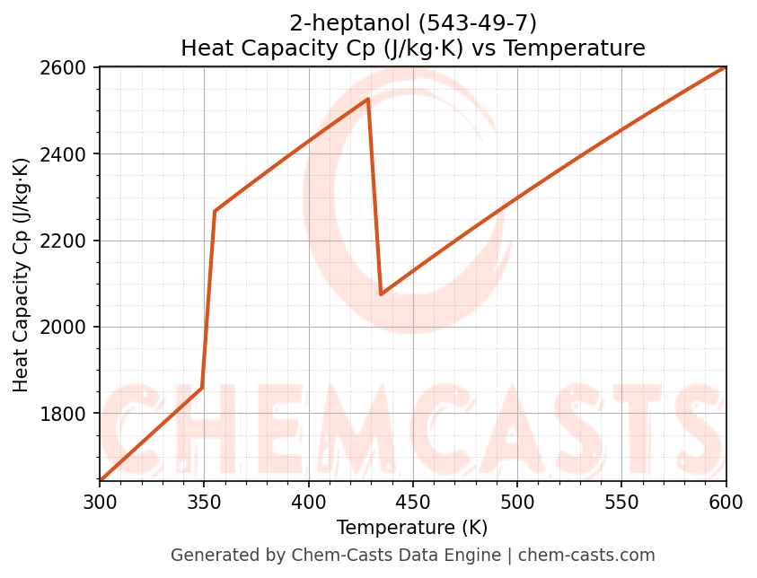 - Specific heat capacity (Cp) indicates the amount of energy required to raise the temperature of 2-heptanol and is critical for energy balance and heat-exchanger design.