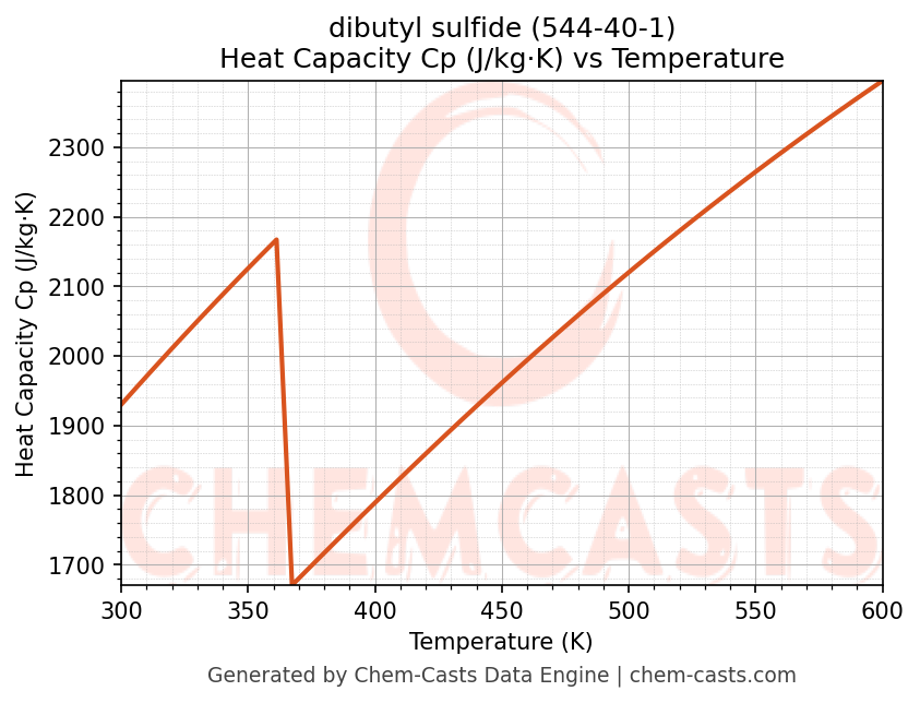 - Specific heat capacity (Cp) indicates the amount of energy required to raise the temperature of dibutyl sulfide and is critical for energy balance and heat-exchanger design.