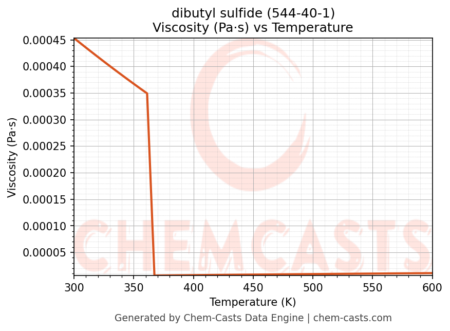 This page presents the temperature-dependent thermodynamic and transport properties of dibutyl sulfide (CAS 544-40-1) calculated at a constant pressure of 1 atm (101325 Pa) over the temperature range 250-500 K.