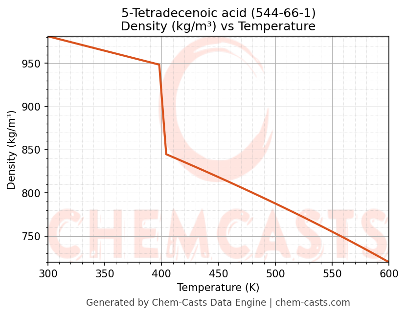 This page presents the temperature-dependent thermodynamic and transport properties of 5-Tetradecenoic acid (CAS 544-66-1) calculated at a constant pressure of 1 atm (101325 Pa) over the temperature range 250-500 K.