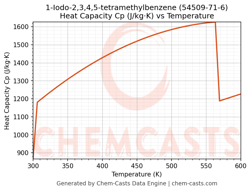 - Specific heat capacity (Cp) indicates the amount of energy required to raise the temperature of 1-Iodo-2,3,4,5-tetramethylbenzene and is critical for energy balance and heat-exchanger design.