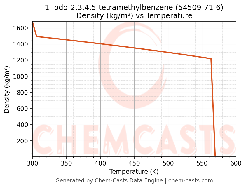 This page presents the temperature-dependent thermodynamic and transport properties of 1-Iodo-2,3,4,5-tetramethylbenzene (CAS 54509-71-6) calculated at a constant pressure of 1 atm (101325 Pa) over the temperature range 250-500 K.