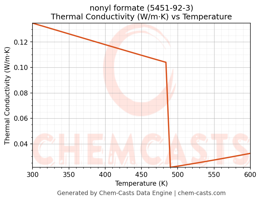 This page presents the temperature-dependent thermodynamic and transport properties of nonyl formate (CAS 5451-92-3) calculated at a constant pressure of 1 atm (101325 Pa) over the temperature range 250-500 K.