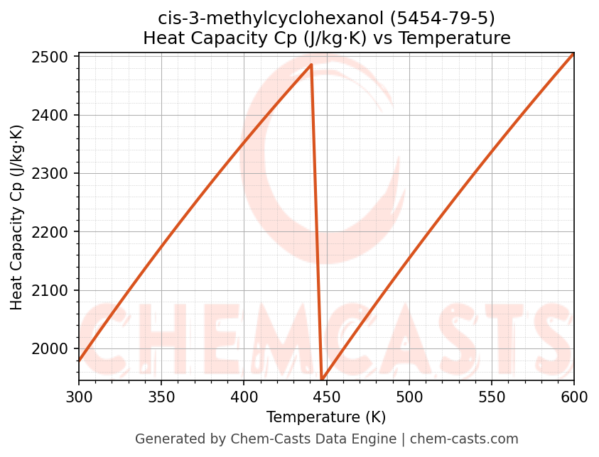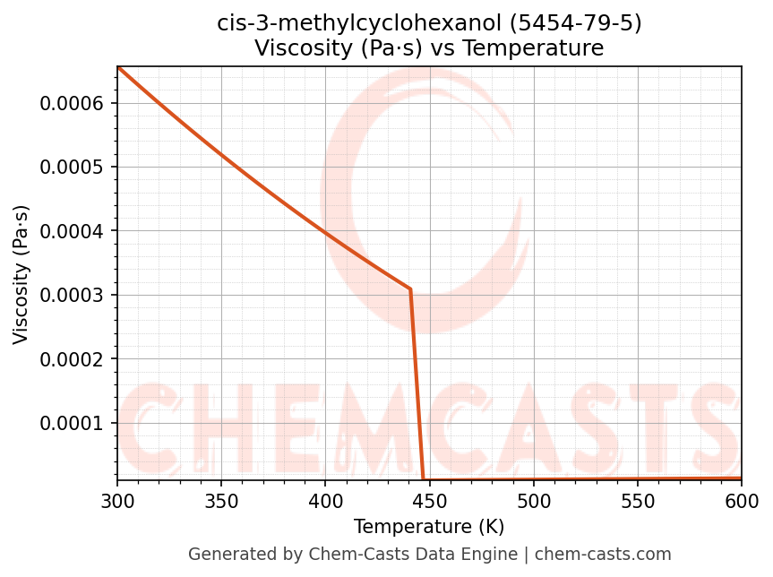 This page presents the temperature-dependent thermodynamic and transport properties of cis-3-methylcyclohexanol (CAS 5454-79-5) calculated at a constant pressure of 1 atm (101325 Pa) over the temperature range 250-500 K.