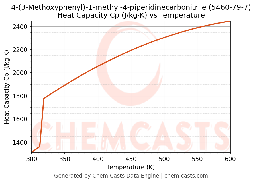 - Specific heat capacity (Cp) indicates the amount of energy required to raise the temperature of 4-(3-Methoxyphenyl)-1-methyl-4-piperidinecarbonitrile and is critical for energy balance and heat-exchanger design.