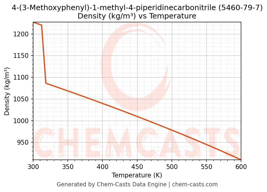 This page presents the temperature-dependent thermodynamic and transport properties of 4-(3-Methoxyphenyl)-1-methyl-4-piperidinecarbonitrile (CAS 5460-79-7) calculated at a constant pressure of 1 atm (101325 Pa) over the temperature range 250-500 K.