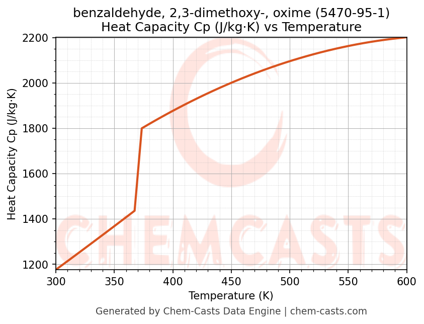 - Specific heat capacity (Cp) indicates the amount of energy required to raise the temperature of benzaldehyde, 2,3-dimethoxy-, oxime and is critical for energy balance and heat-exchanger design.