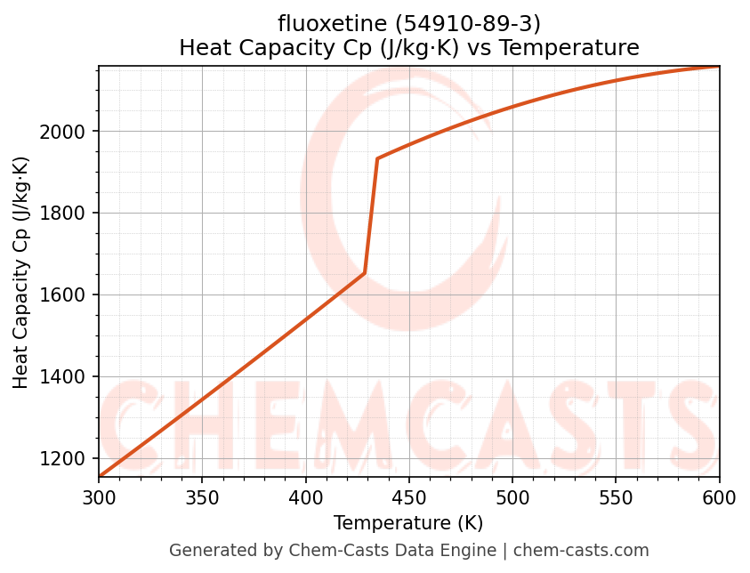 - Specific heat capacity (Cp) indicates the amount of energy required to raise the temperature of fluoxetine and is critical for energy balance and heat-exchanger design.
