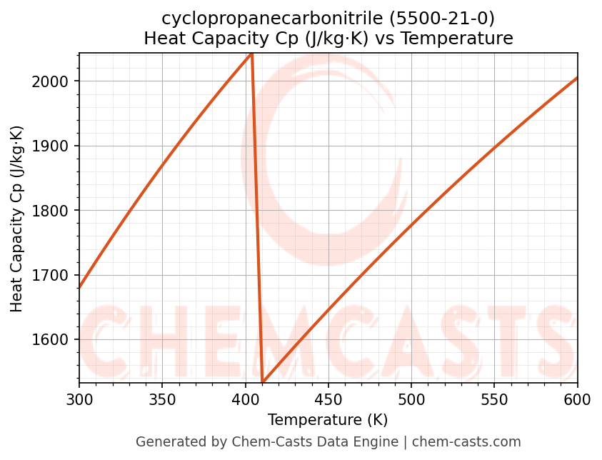 - Specific heat capacity (Cp) indicates the amount of energy required to raise the temperature of cyclopropanecarbonitrile and is critical for energy balance and heat-exchanger design.