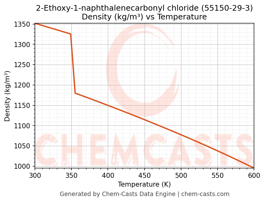 This page presents the temperature-dependent thermodynamic and transport properties of 2-Ethoxy-1-naphthalenecarbonyl chloride (CAS 55150-29-3) calculated at a constant pressure of 1 atm (101325 Pa) over the temperature range 250-500 K.