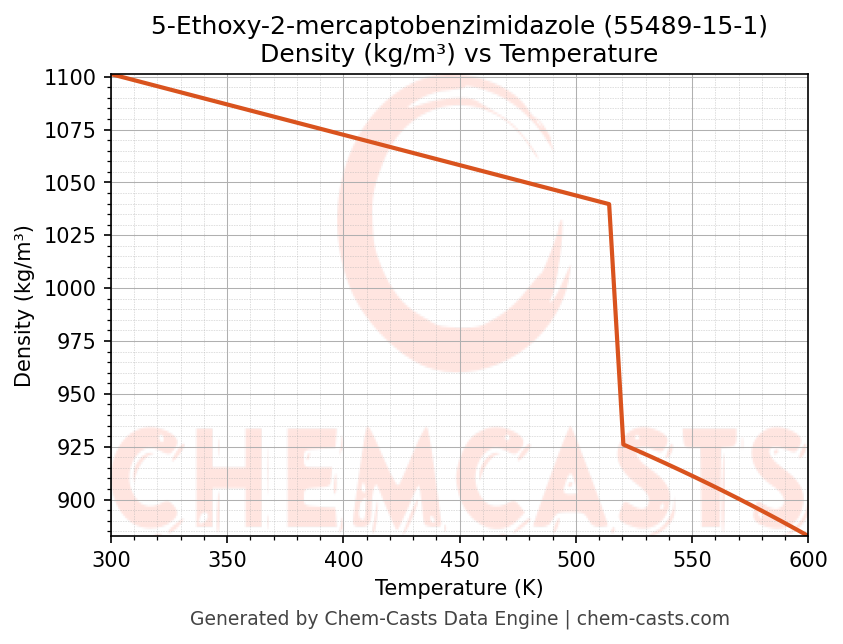 This page presents the temperature-dependent thermodynamic and transport properties of 5-Ethoxy-2-mercaptobenzimidazole (CAS 55489-15-1) calculated at a constant pressure of 1 atm (101325 Pa) over the temperature range 250-500 K.